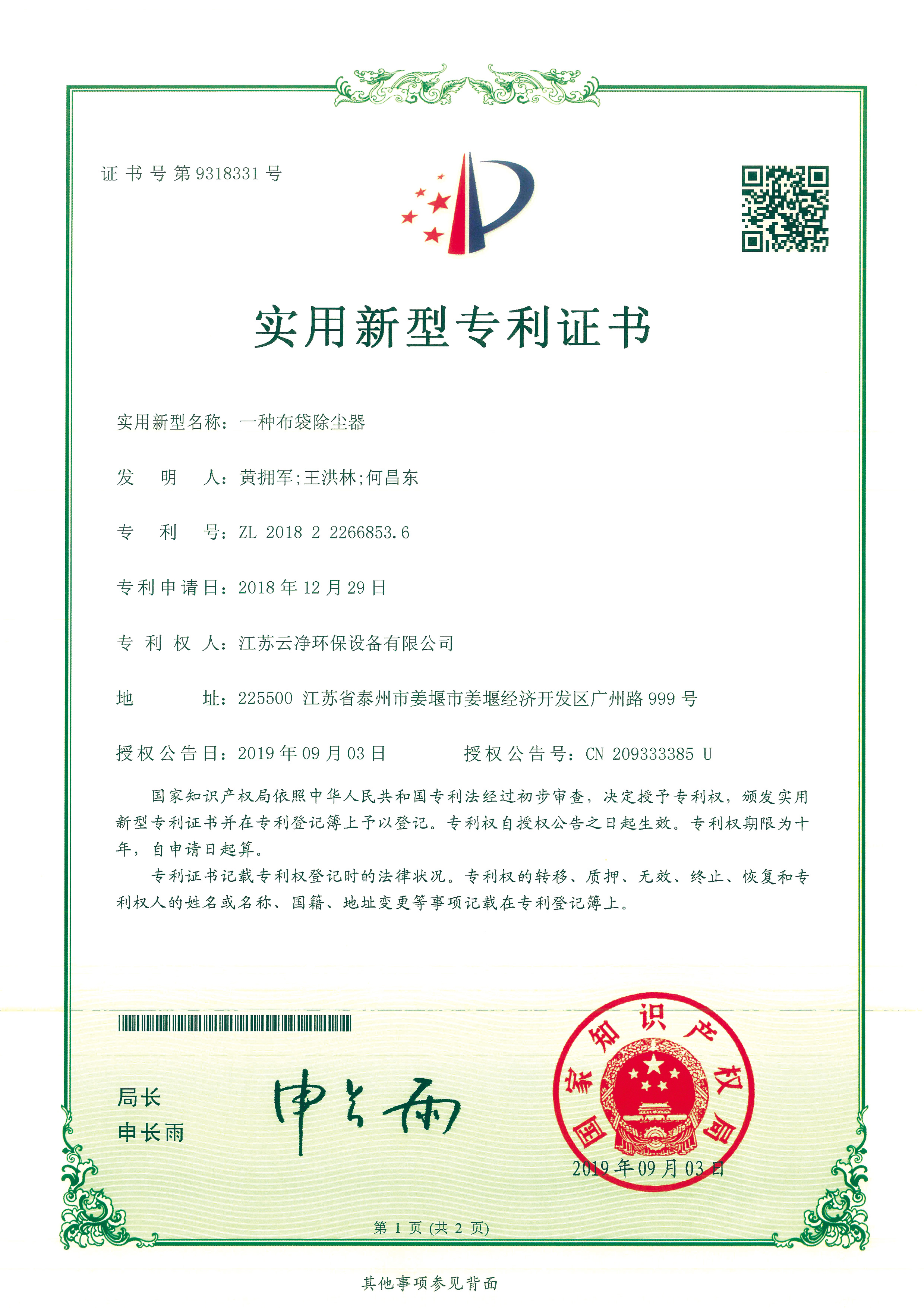 公司先后獲得“江蘇省民營科技企業”﹑“環保產業骨干企業” 、“重合同守信用AA級企業” 、通過ISO9001:2015質量體系認證、ISO14001:2015環境管理體系、知識產權管理體系和ISO45001:2018職業健康安全管理體系認證,為江蘇省高新技術企業。多項產品獲得高新技術產品認定,擁有發明及實用新型專利31件(ZL202020254279.7、ZL202020254287.1、ZL202020288783.9等),現有各類除塵設備﹑脫硫設備﹑超凈排放設備八大類近200個規格產品,特別是開發出國內的有色冶煉系統收砷布袋除塵器,該設備開創了收砷布袋除塵器先例,本體使用壽命可達十年之久,是國內其他設備無法比擬的。公司具備良好的產品研發能力,通過與相關科研院所技術合作開發了高效除塵器、燒結板除塵器、濾筒除塵器、脫硫濕電超凈排放一體化設備、中低溫脫硝設備、等離子體除臭設備等,產品受到用戶的一致好評。